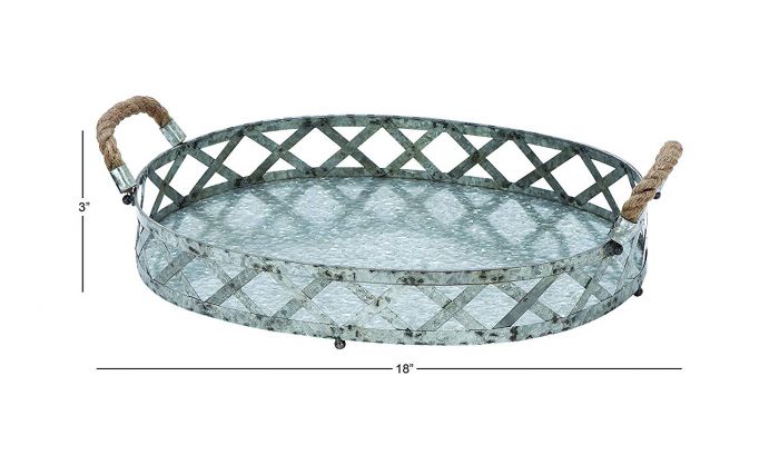18" rustic galvanized iron strip, cross weave trays, hammered finish with natural rope carrying handles, solid distressed finish bottom with iron ball castors.